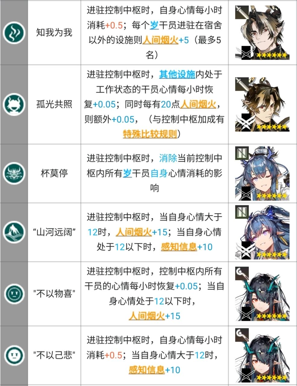 令:清除中枢中其他岁成员心情影响(即所有人心情变化速度一致),和夕相反,一半以上+15人间烟火,一半以下+10感知信息(注意力涣散技能失效,禁止屑博士压榨干员)