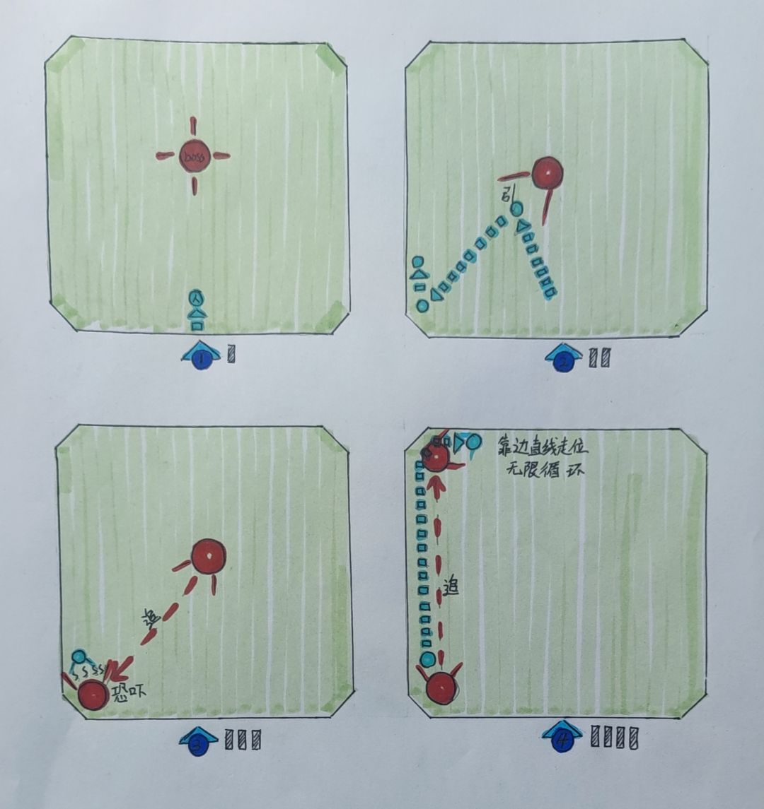 BOSS开启后,它会在中间,也会四处游荡,我们往他身边走,离他5码距离左右时它会开始追击你,第一时间往左下角走,然后在角落往上走,让BOSS呆在墙角,你背后留出一条长道,boss恐吓,你会沿着墙壁直线跑,当你跑到左上角时往右走一点,再次让BOSS站在墙角,你背后留出一条长道。