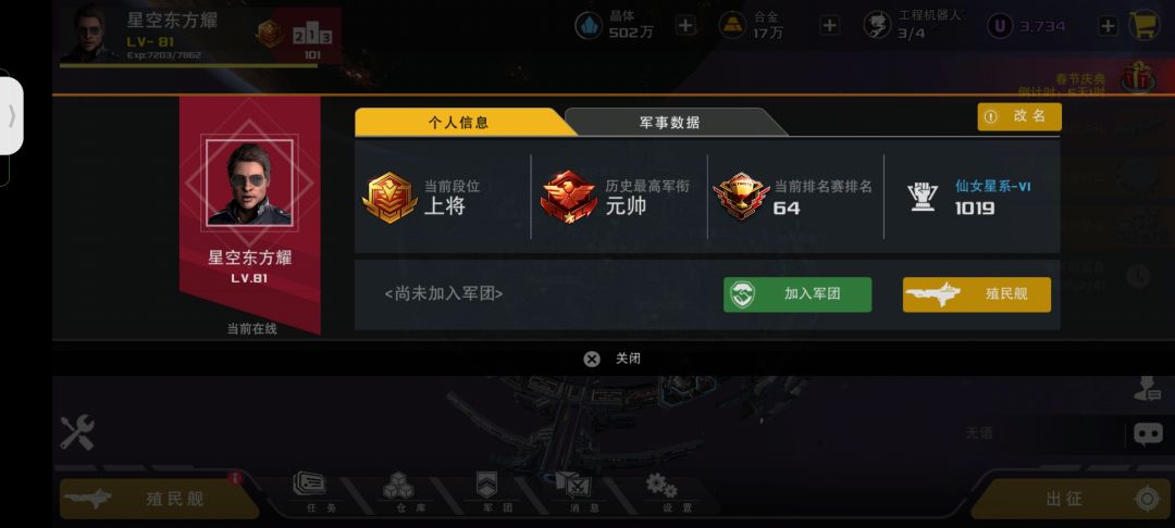 。最近各个团之间的事倒是挺复杂的,咱们下面再说,让我们先看耀耀如何?零氪81级,64名是偷着打上去的,上将倒是可以稳住啦,还有就是一年的号咋这低级,原因只有一个,要塞没吃够、要塞没吃够、要塞没吃够(现在改py了,懒得打要塞了都)!三研护卫血少了点,我只能说都怪压级怪惹的祸(都怪我当初年少气盛听信压级怪谣言呜呜呜呜),以为有个极品护卫就能完美压级了,结果被坑的我裤衩都没剩下,就这样我的毁灭和舰炮就这么跟随历史的脚步与我渐行渐远了