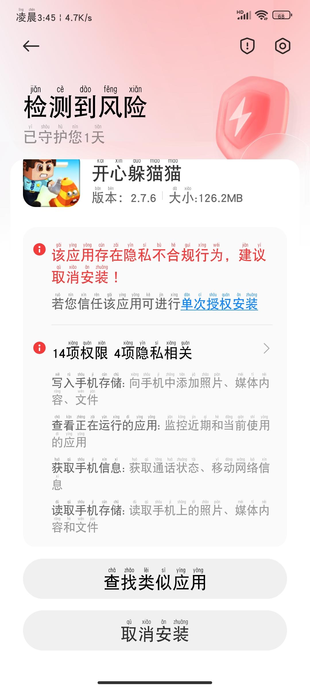 牛逼,这么多正规游戏,除了那些不正规的以外你是唯一一个提示风险,还要监控最近运行应用的