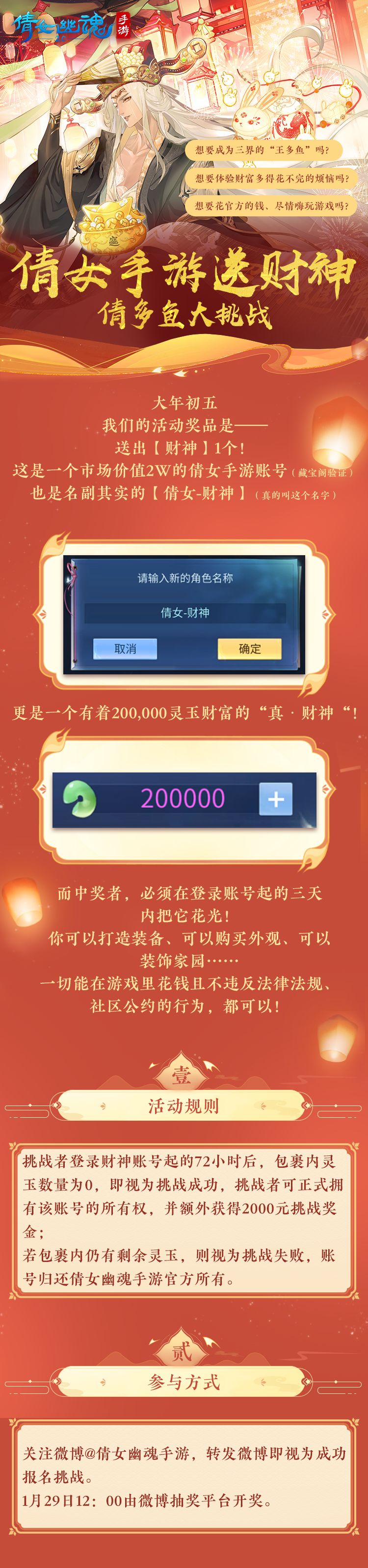 出于赠送人选的公平性考虑,活动设置在微博@倩女幽魂手游 ,将由微博抽奖平台抽出这位锦鲤,即刻获得【财神】账号3天使用权和包裹自带的200000灵玉。