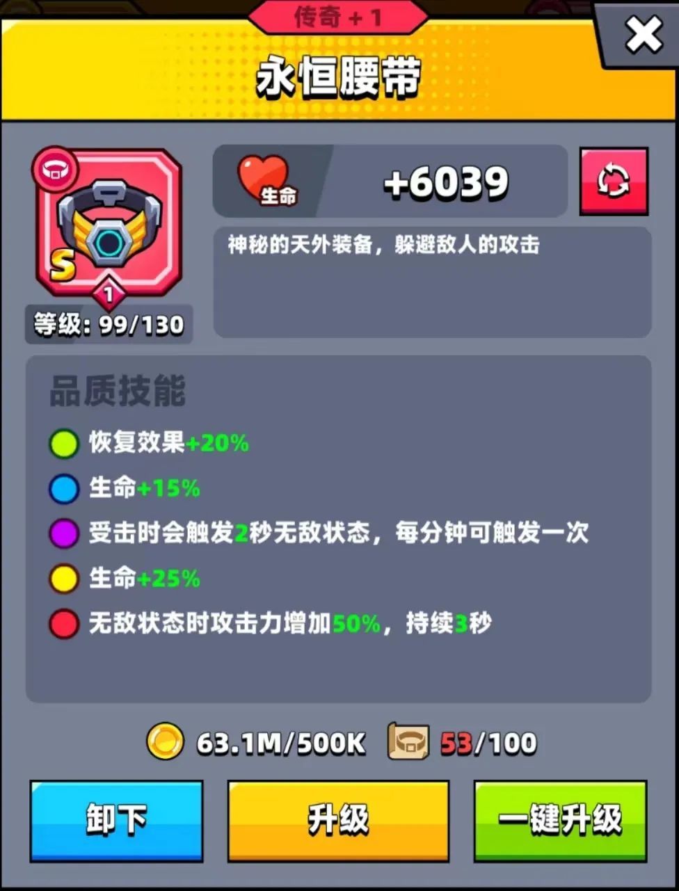 显而易见,时尚腰带和军用腰带是普通装备,比S腰带少了15%的生命,S装备的优势就是面板攻击生命高。时尚腰带每击杀200只怪物就有一个护盾,在超级挑战里面有奇效,几秒钟就有一个护盾,附带一秒无敌。