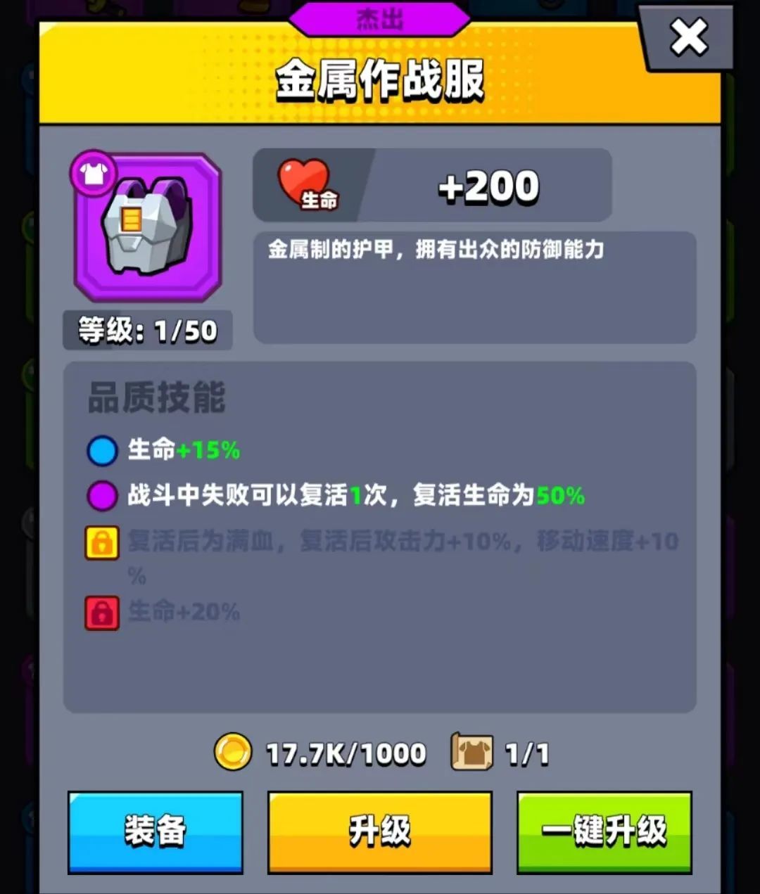 金色品质:当装备品质达到金色时,激活品质技能,复活后为满血,复活后攻击力百分之十的攻击力,移动速度增加百分之十。