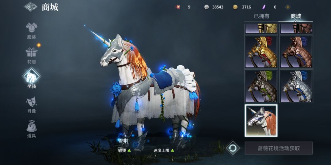 而外观更是我们选择坐骑的另外一个重要因素,誓要当猎手战场里最靓的崽!比如下面这款雪荆皮肤(蔷薇花镜活动获得),浑身散发蓝色的光芒,充满了灵气,而雪白色的马身与银色的面罩相搭配,再加上头顶犄角的存在,让人无不以为此乃仙马。