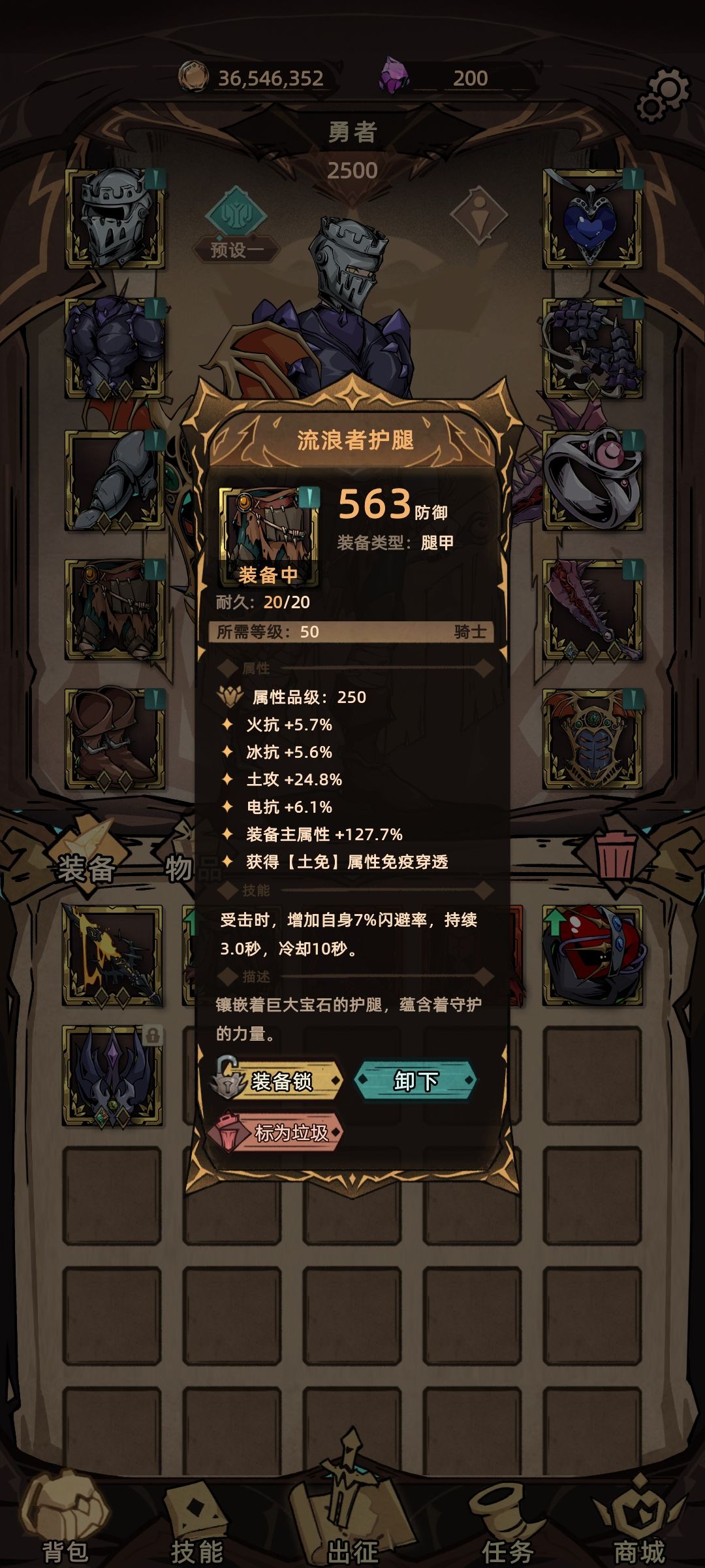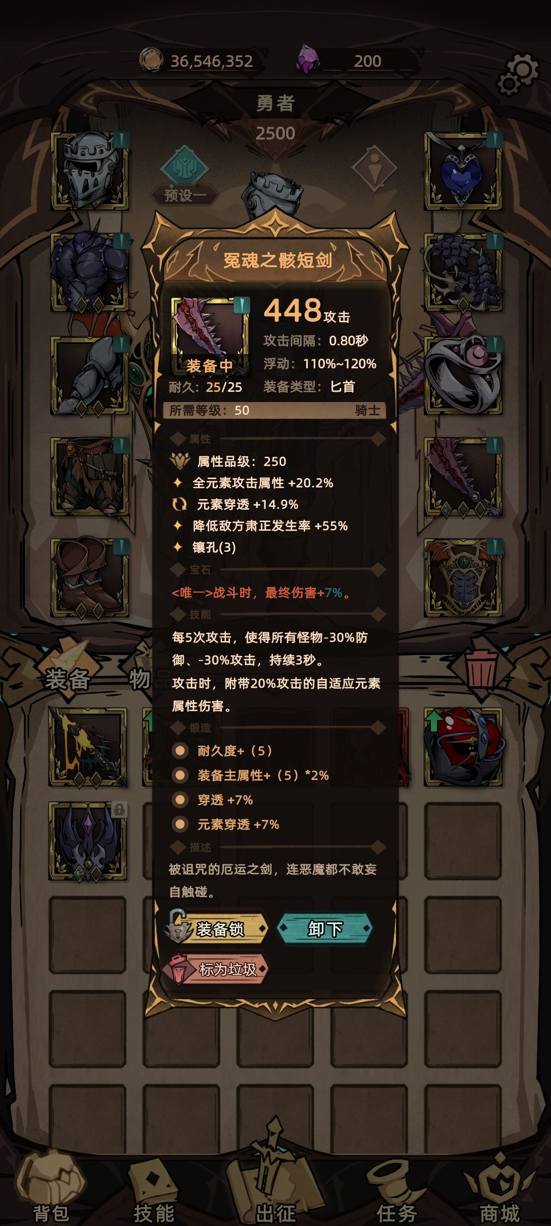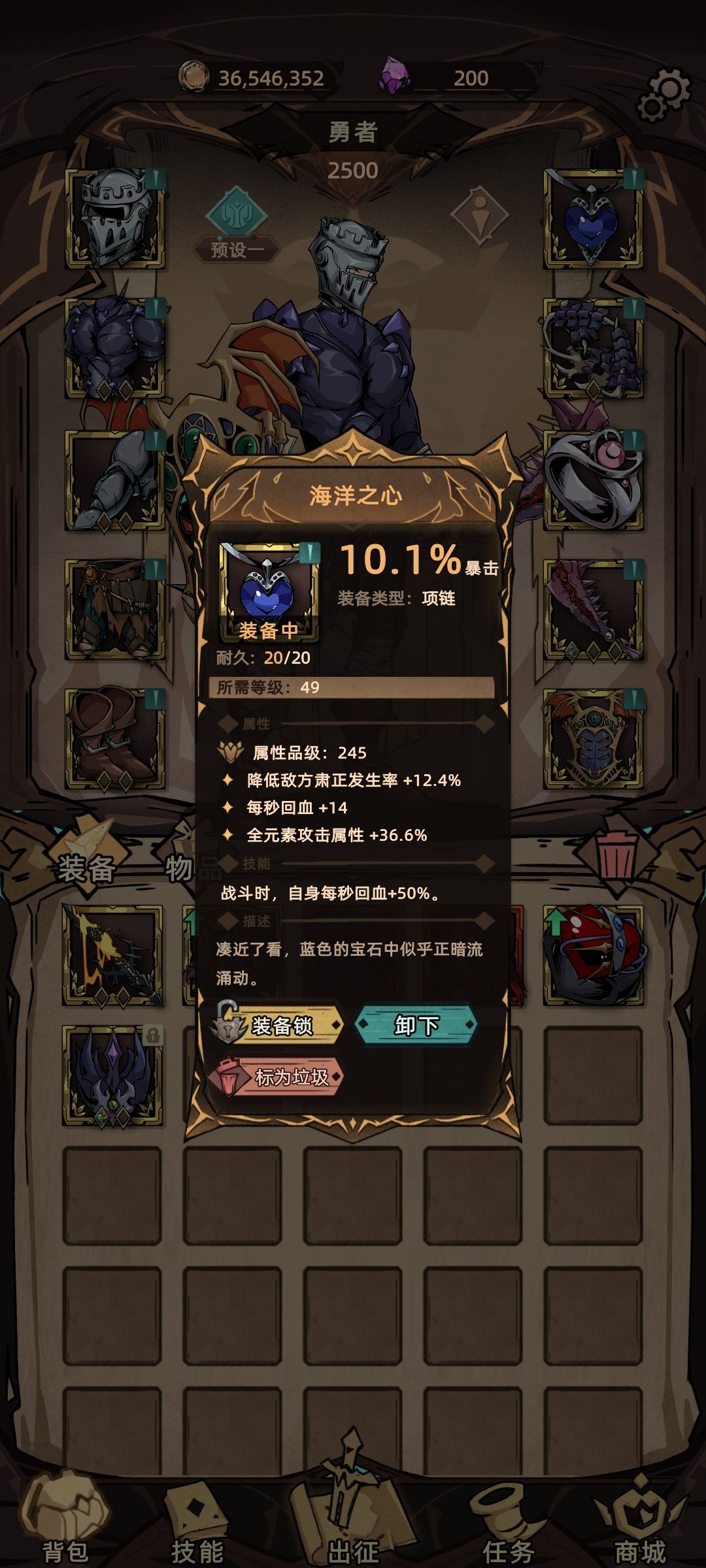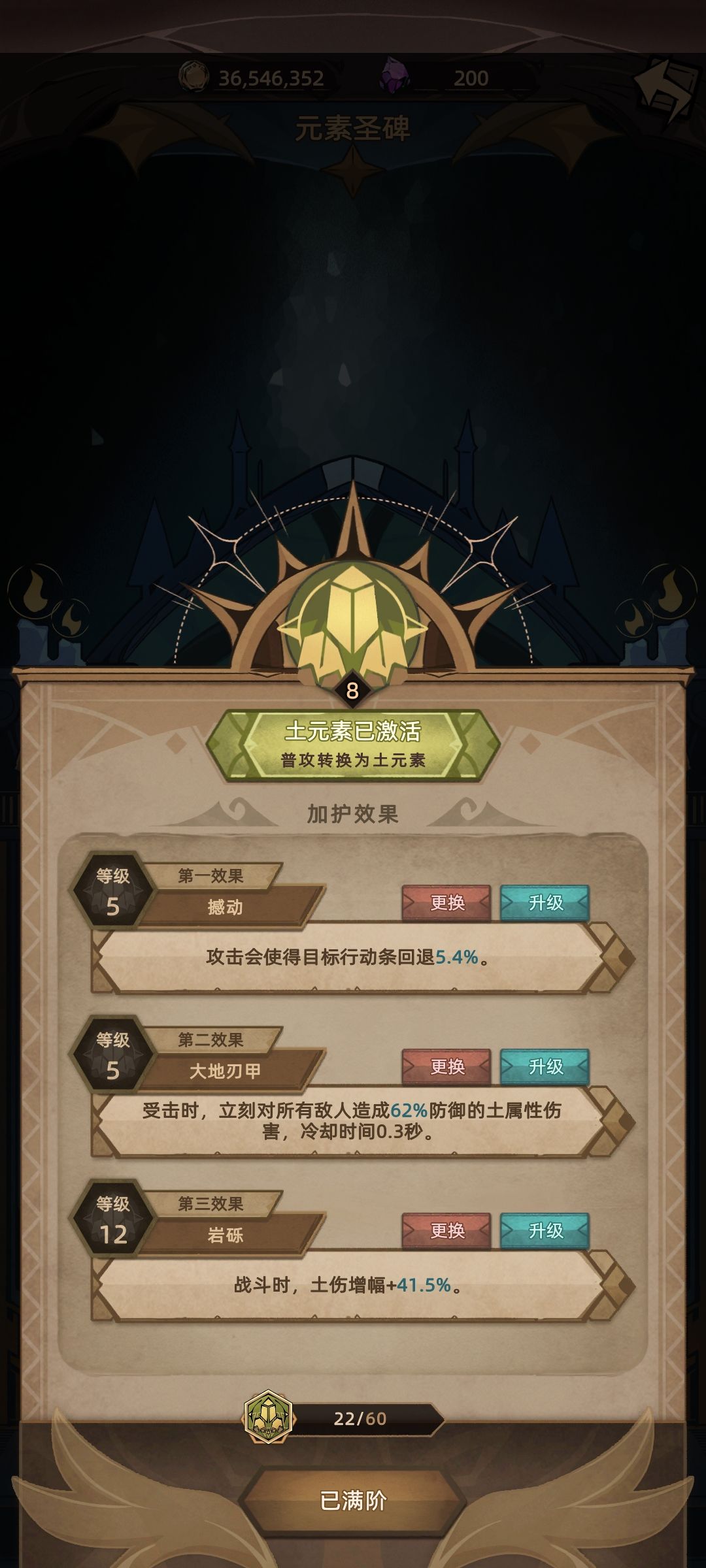 选择吃防御的土伤,受击对所有敌人造成防御相关伤害,保证刷图,打boss可换其他,攻击回退行动条保证生存,想要选择其他元素也是可以的,需要你自行选择装备灵活变通了,甚至物伤也可以玩,那技能就要选择圣锤系了,可以使用无敌一秒的技能。
