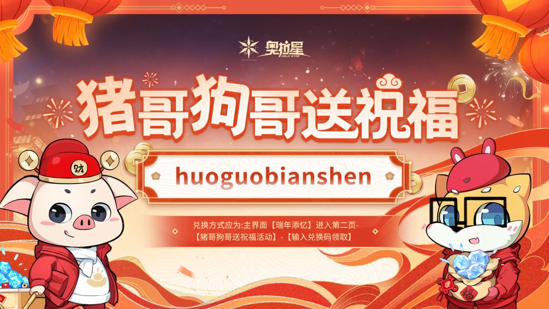 领取方式:兑换方式应为:主界面【瑞年添忆】进入第二页-【猪哥狗哥送祝福活动】-【输入兑换码领取】
