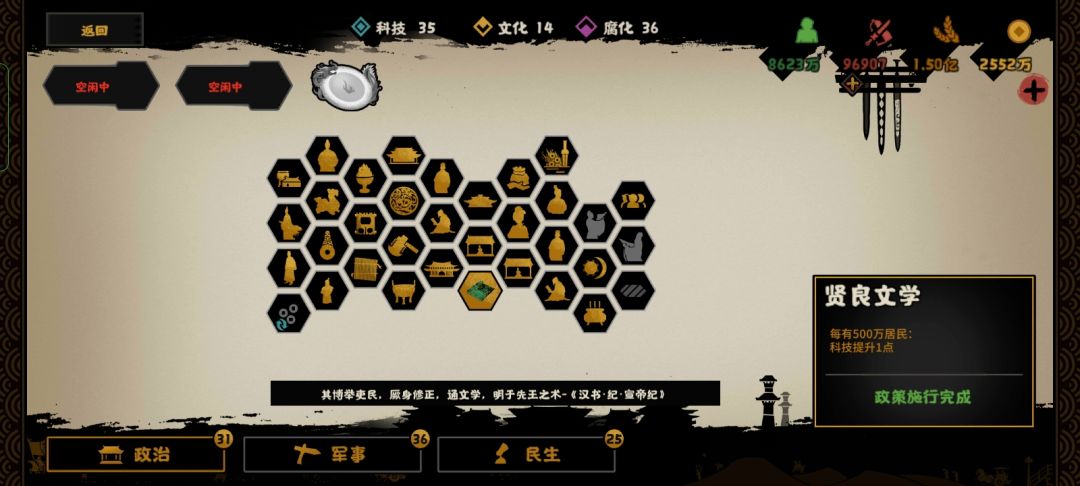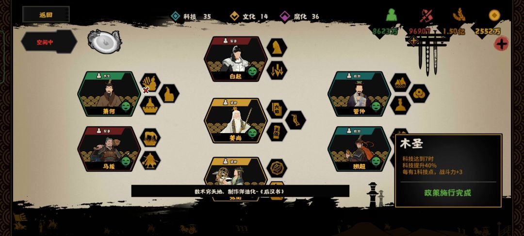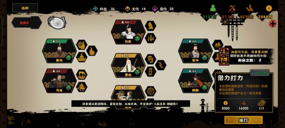 如图所示,白渠,循环政策,配上这两个,名臣和时代政策,名臣是这个本里可以招募