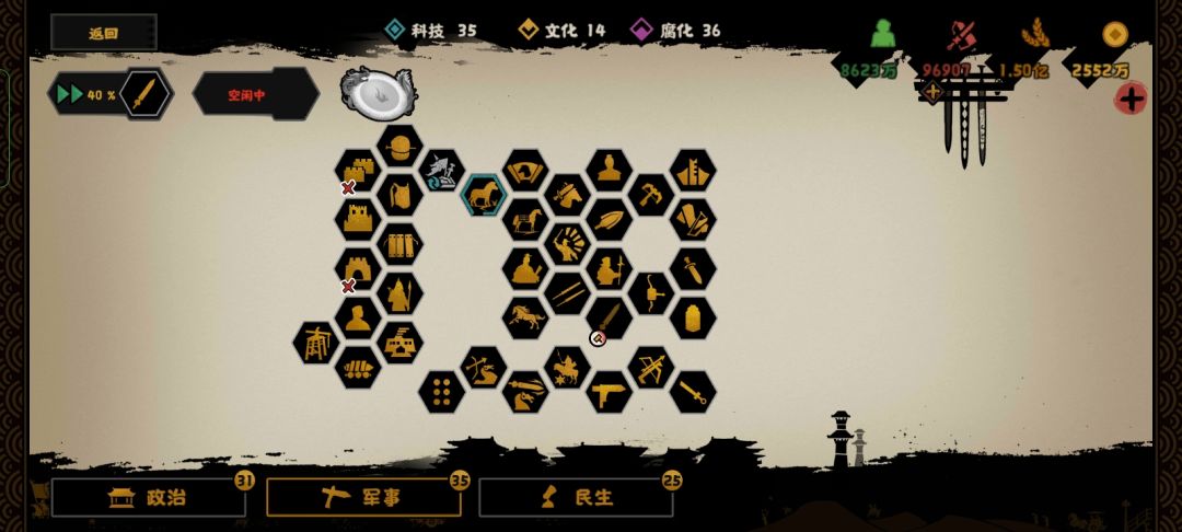 又经过了漫长的等待,终于把军事给熬完了,(挑战模式只能线上挂机)但兵太少了我现在打一次军团规模七八万,九万兵实在不够霍霍。