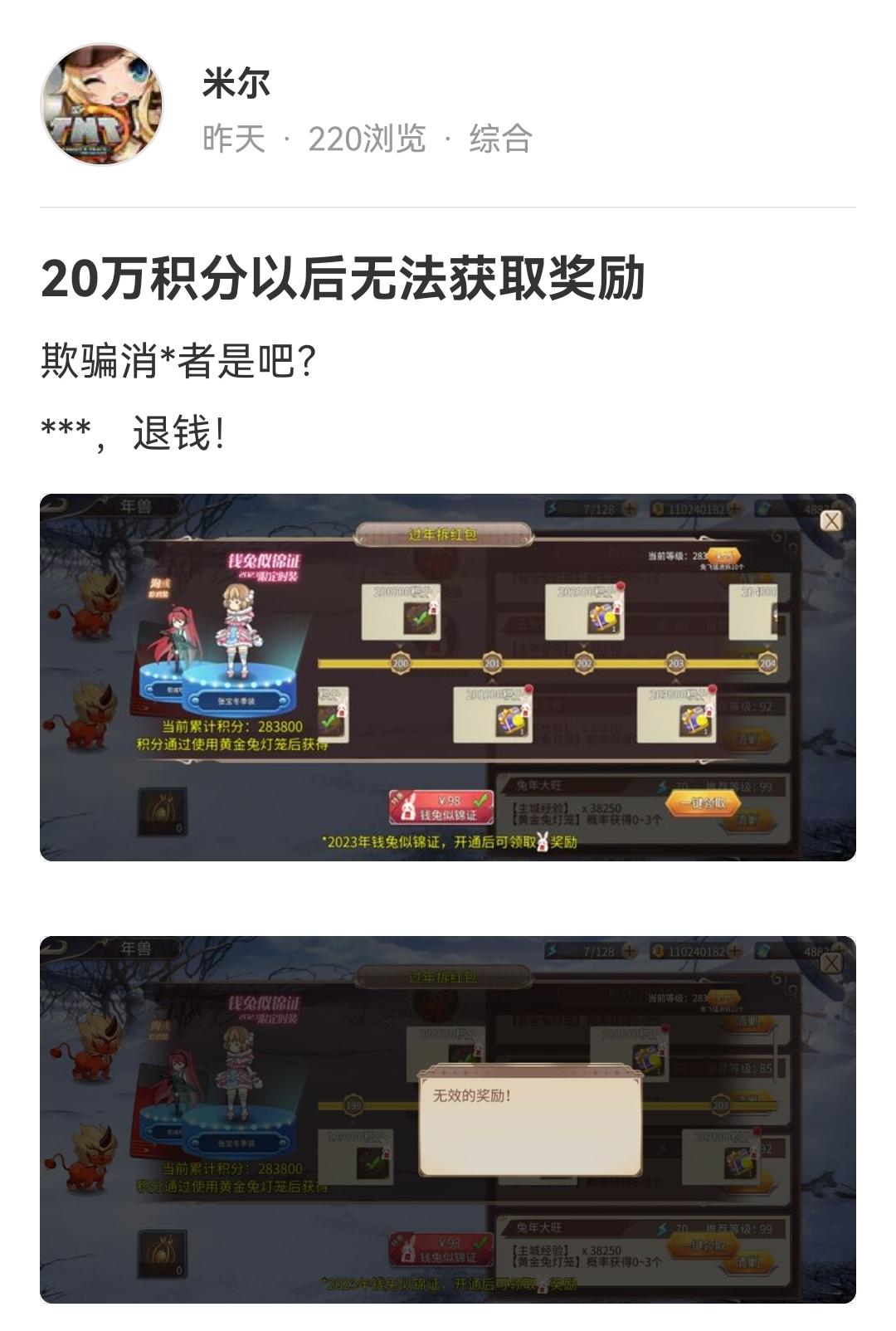 昨天是20万积分后无法正常获得奖励,经过运营修复,变成30万积分以后无法活动奖励(现在是多少积分我也不知道)