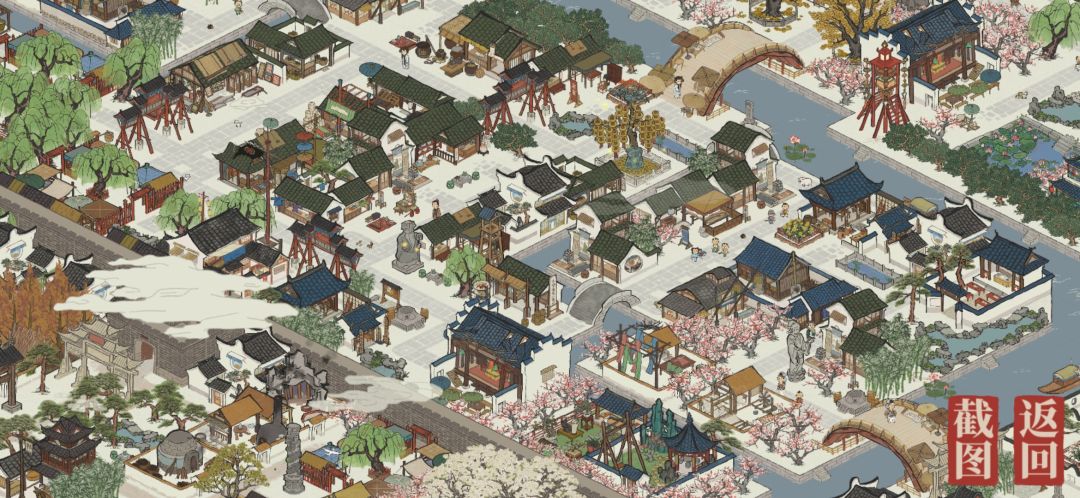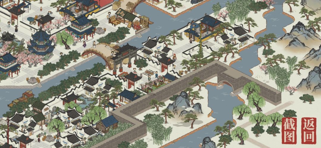 在城墙两侧,分别是集市区和休闲区,两个集市和后面的花鸟鱼虫市场(用盆景园充当)是居民们购买一天食材的去处,而休闲区有着剧院,盆景园及花园,人们可以在饭后来这里散步聊天。