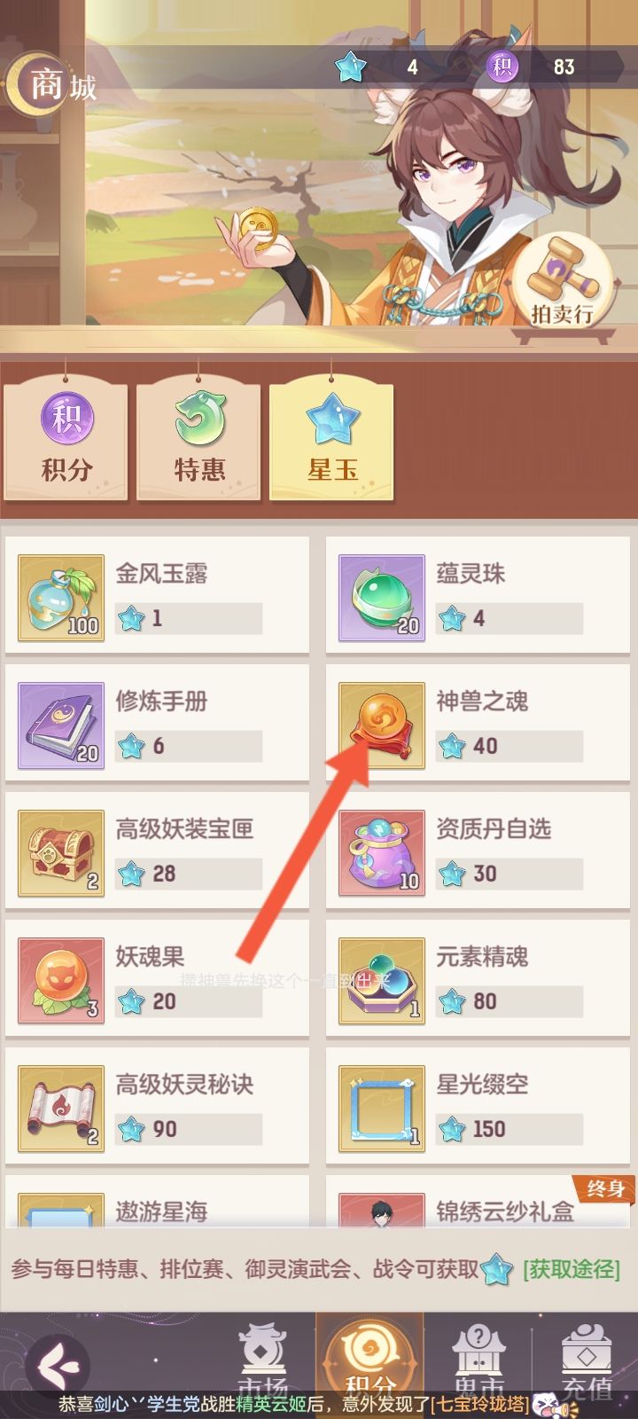 星玉商店。攒神兽期间就换40星玉的神兽灵,攒出神兽就开始存着。