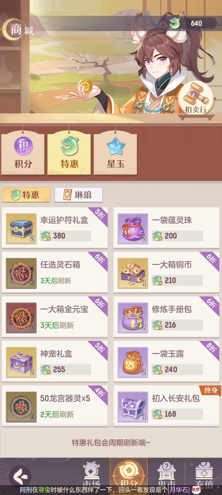 特惠商店。任选灵石箱,价格180绑定灵玉,自选20个灵石,这是绑定的不能卖,换什么大家应该应该都懂。一大箱金元宝,攒神兽要买,攒出来以后不清楚看自己需求。修炼手册包,修炼6级开始就要很多书了,买多少看灵玉情况,我抽了转盘暂时不够买。珍兽入世礼包,价格1980绑定灵玉,30个珍兽灵,自己留意新区珍兽灵涨幅,火区三四天能到一万一到一万二,这时候卖掉有将近38万元宝,不火的区应该没那么高看涨幅自己决定什么时候卖。其他不是很推荐现在买,法宝珠前期10级就行了因为要攒神兽,其他的好多有运气成分,所以现在不买。