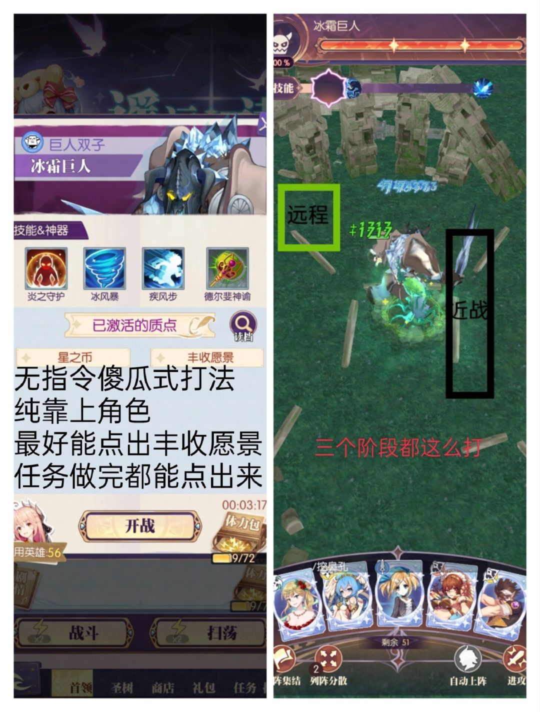 核心宗旨就是只要站位够ok,就不需要考虑指令。丰收拿来给主角回血的,活动前两天免费礼包加做任务给的原数肯定够点出来。最优是每个阶段都配个奶,抬一下英雄血量,不过只要主角能活着,就能刷到奶妈,除非脸特别黑,没必要重开刷起手。