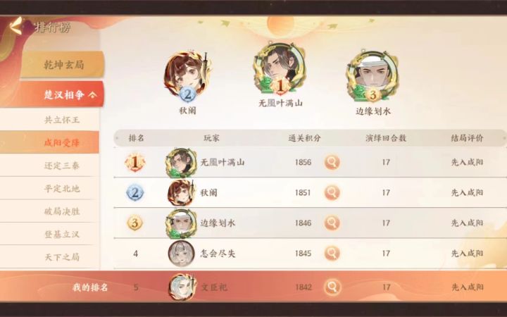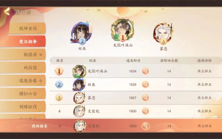 分三段,一二段跟着打没什么问题(运气不太差的话),毕竟这个看脸,外交有时候出现上供直接扣一千五粮草的都有这种直接重开,第三段冲分的话就不一定能一样走,主要是不能估计粮草金钱的数量和兵力,不过带队去打基本上都能赢也不知道为什么……