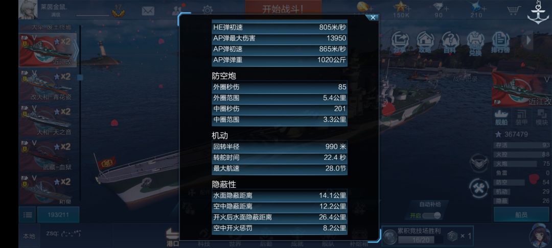 可在航母局出场。缺点是大和一系的通病抗线能力薄弱,弱火,且损管保护期仅有10s。