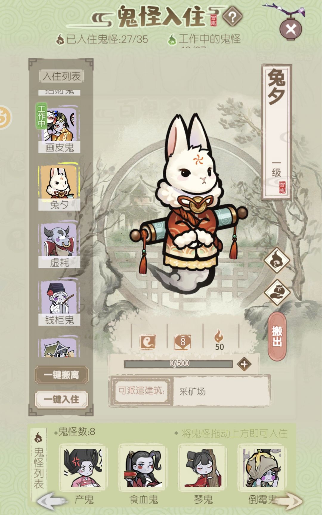 如图,在图鉴里兔夕是在游览类里,但在鬼怪入住界面却在矿场