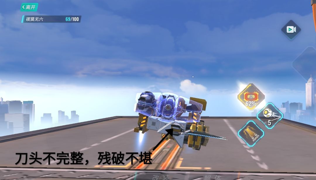 移动模块可以缺少,结构可以稍有破损,但刀头一定要保证冲锋前完好无损,前置刀头是冲锋,最基本也是最重要的攻击方式,稍有残破,便会败北