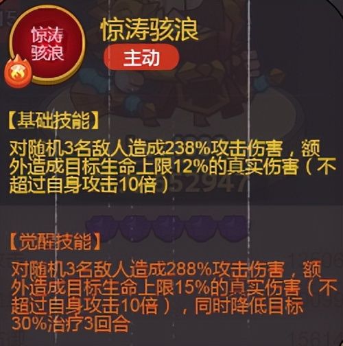 对随机3名敌人造成238%攻击伤害,觉醒之后提高50%,孙策作为肉盾这点伤害就不用去看了。真实伤害从12%增加至15%,但是上限还是10倍,提升了一点输出。降低目标30%治疗3回合,推图打华佗、董卓这种BOSS更好打了。