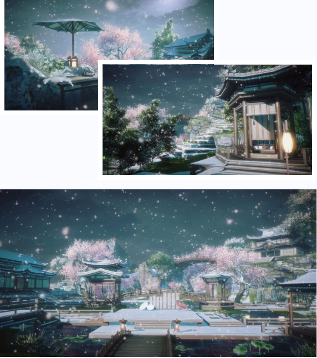 在浪漫月光之下,雪华洋洋洒洒飘落,与朋友们共奏一曲致天谕敬友情,身后的古木也跟着摇晃起来,