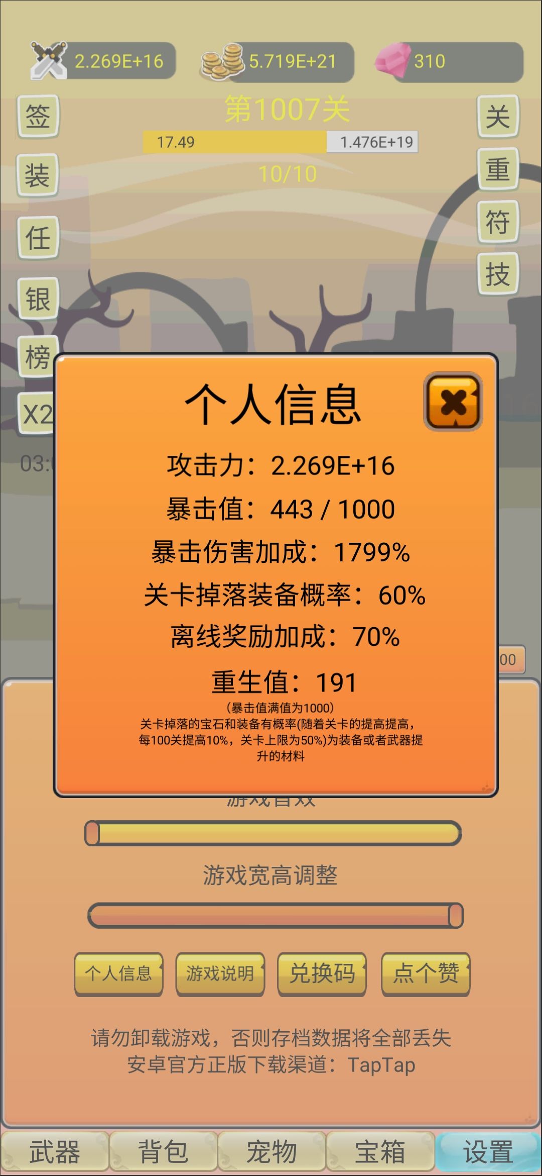 玩了两天,每天除了重生一次和重置关卡两次之外,似乎就没什么提升了,买了新武器也没什么提升,我觉得可以参考一下十万个大魔王,转生给材料,转生关卡越高给的材料越多,材料用来点天赋,天赋可以提高伤害,掉率之类的,不限制转生次数,不过转生之后就提高下一次转生的等级限制(例如第一次转生要求300关,第二次400关,第三次500关这样),这样玩的还比较有动力一点