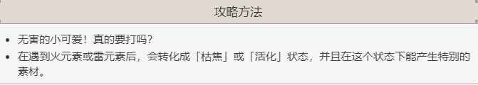 在蕈兽初次收到雷、火元素攻击后,会进入活化或者枯焦状态,击败状态改变后的蕈兽,会获得不同的战利品。如果我们不知道蕈兽的这个特性,胡乱用技能打伤害,对于我们刷取掉落物的效率会有很大的影响,走了很多不必要的弯路,例如我本来想刷蕈兽孢子,结果打了半天刷了一顿失活的菌核。