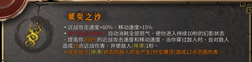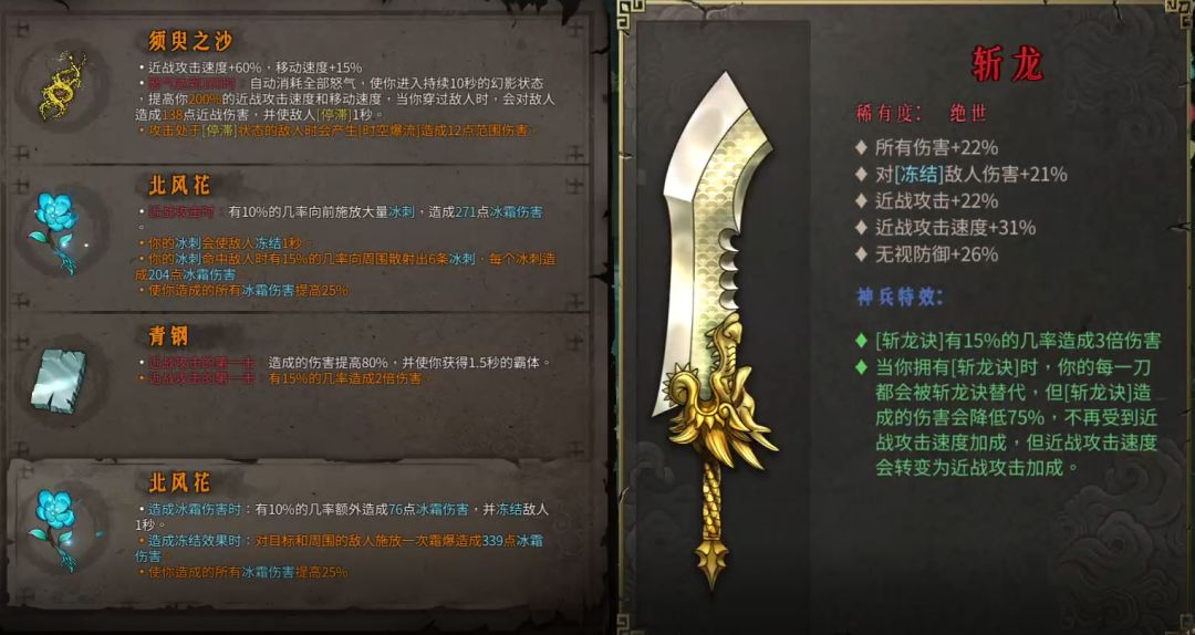 斩龙冰由于攻速固定,白霜的触发频率必然比不上攻速冰2。所以相比常规冰2推荐的冰块北风花,三色24双北风这样堆触发打高攻速特效的圣物,须臾之砂不仅可以将高额的攻速转换为近战伤害,还能大大提高我们的机动性与清怪效率(斩龙诀对攻击范围有显著提升)