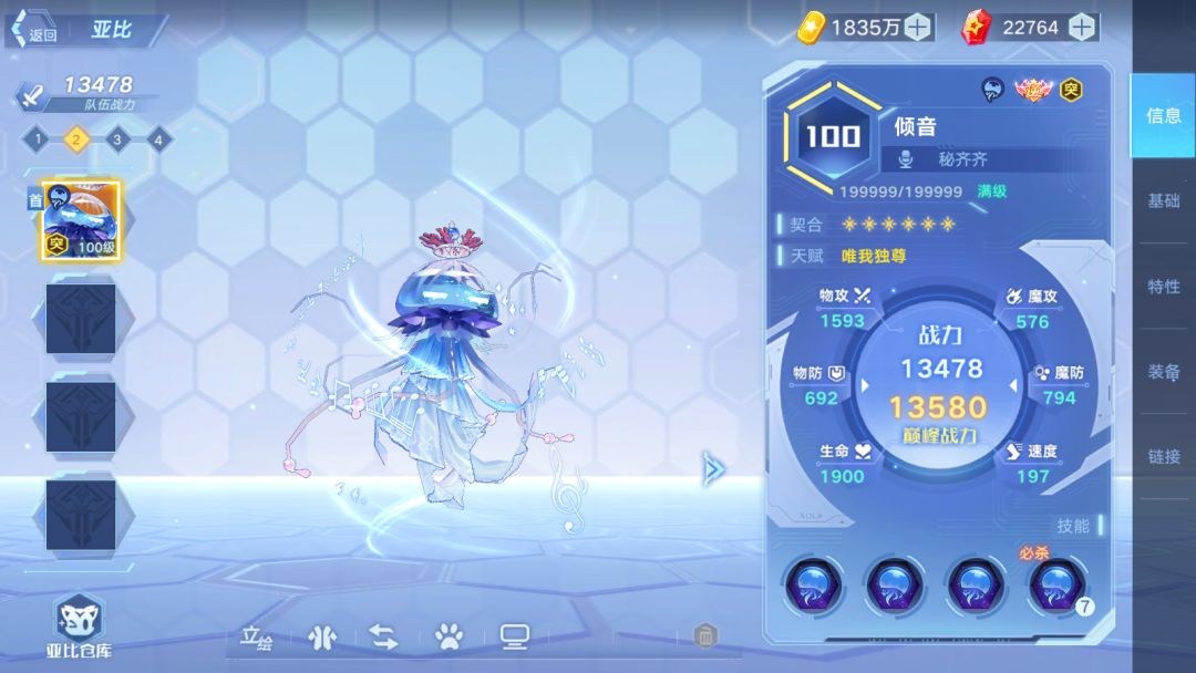 有点类似于库奇的机制,削弱对方的进阶属性,开大招后变成偷取并赋予我方全体,最高能偷取50%进阶属性,吸取的属性归藏是可以吃到的,而且增幅非常大(如图所示,倾音开大后归藏阳极能量直接干到1684),比吃尸体更快更多,可以开发倾音+归藏的快速核爆打法;