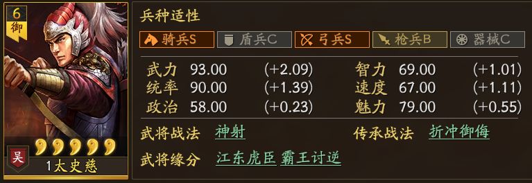 此外,还有三势阵加成的主动战法几率、虎豹骑给吕布的突击加成几率(先攻遇袭抛下还能打,这俩是万万不能下的)。再加上太史慈的当锋,能够破解很多队伍的套路,比如吴骑、太尉盾等等,很难有一线队伍不依赖指挥被动的,在有太史慈连击的情况下,当锋有更高概率打出,一旦打出,这种一线队伍的输出、防御都会遭到一定程度的破坏,不论是哪种都给我方吕布可乘之机。