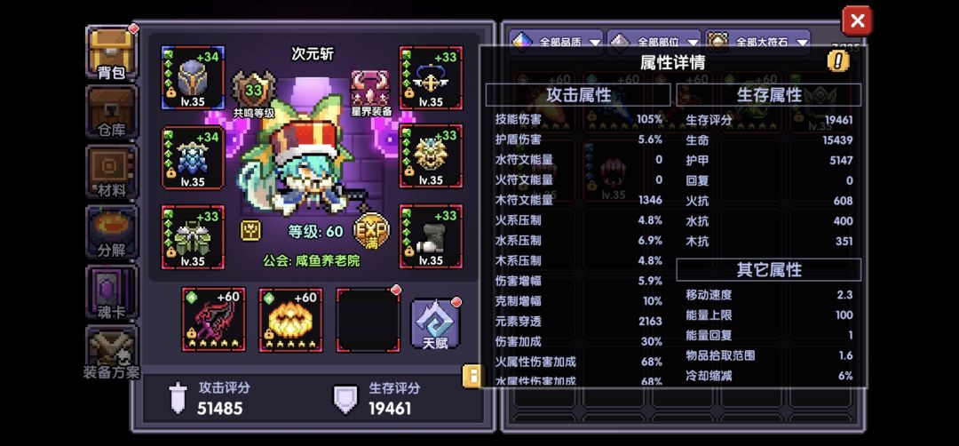 这里可以看到我符文能量1346,已经比较高了,我们就按1500符文能量来算,木属性伤害再加46.2(已经算上了四星芙法魂卡效果),此时木属性伤害为389.5%,此时135%属性伤害实际伤害提升为27.58%,高于应答。