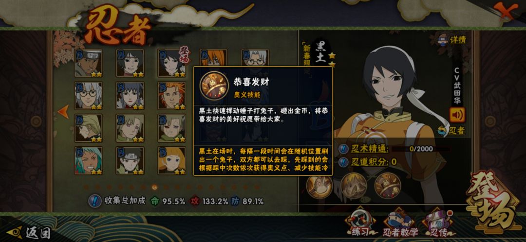新春黑土这个免费的B忍者还是非常好玩的,至少我个人感觉比新春迪达拉好玩多了,新春黑土二技能感觉有些敷衍外其他感觉还是非常不错的。下面就看看新春黑土的技能机制吧。先说一下新春黑土的特殊机制,就是每隔一段时间场上面会出现一个兔子头,和圣诞黑土的那个机制差不多,敌我双方都是能拾取,第一次加一个奥义点,第二次捡到减少技能CD,第三次捡是增加霸体效果时间5秒,之后再捡到都是加霸体效果。普攻1a是平推效果,2a还是平推效果,12a能无限平推,但需要掌握好节奏,3a有击飞扫地效果,4a旋转攻击敌人有扫地效果,5a用锤子敲击敌人也有扫地效果,所以新春黑土普攻整体还是非常稳定的。