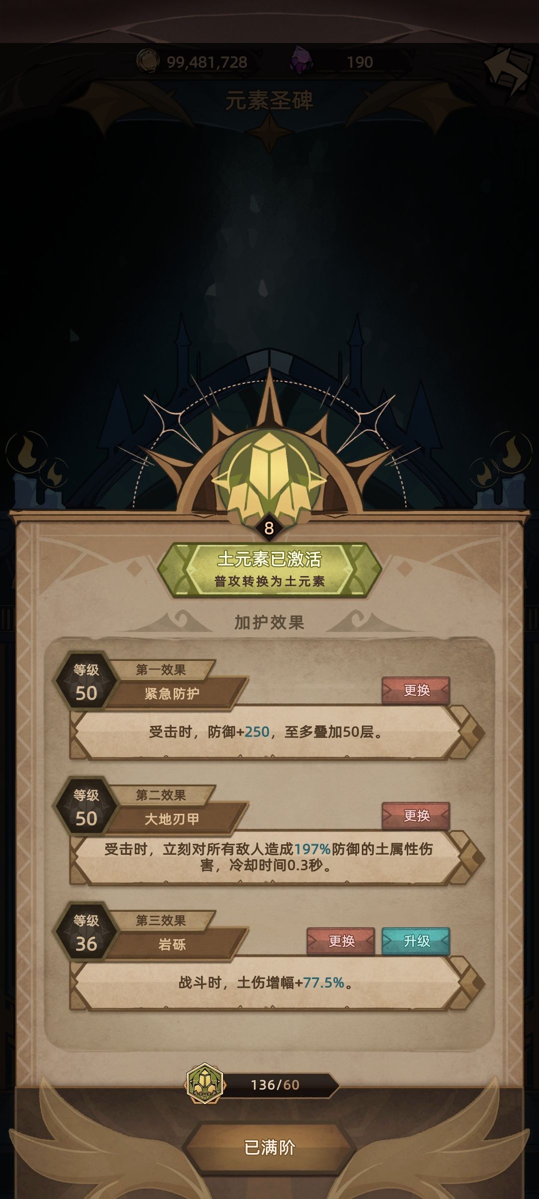 属性完全没用,只需要攻击对自己造成伤害的效果来触发土元素圣碑的紧急防护和大地刃甲。