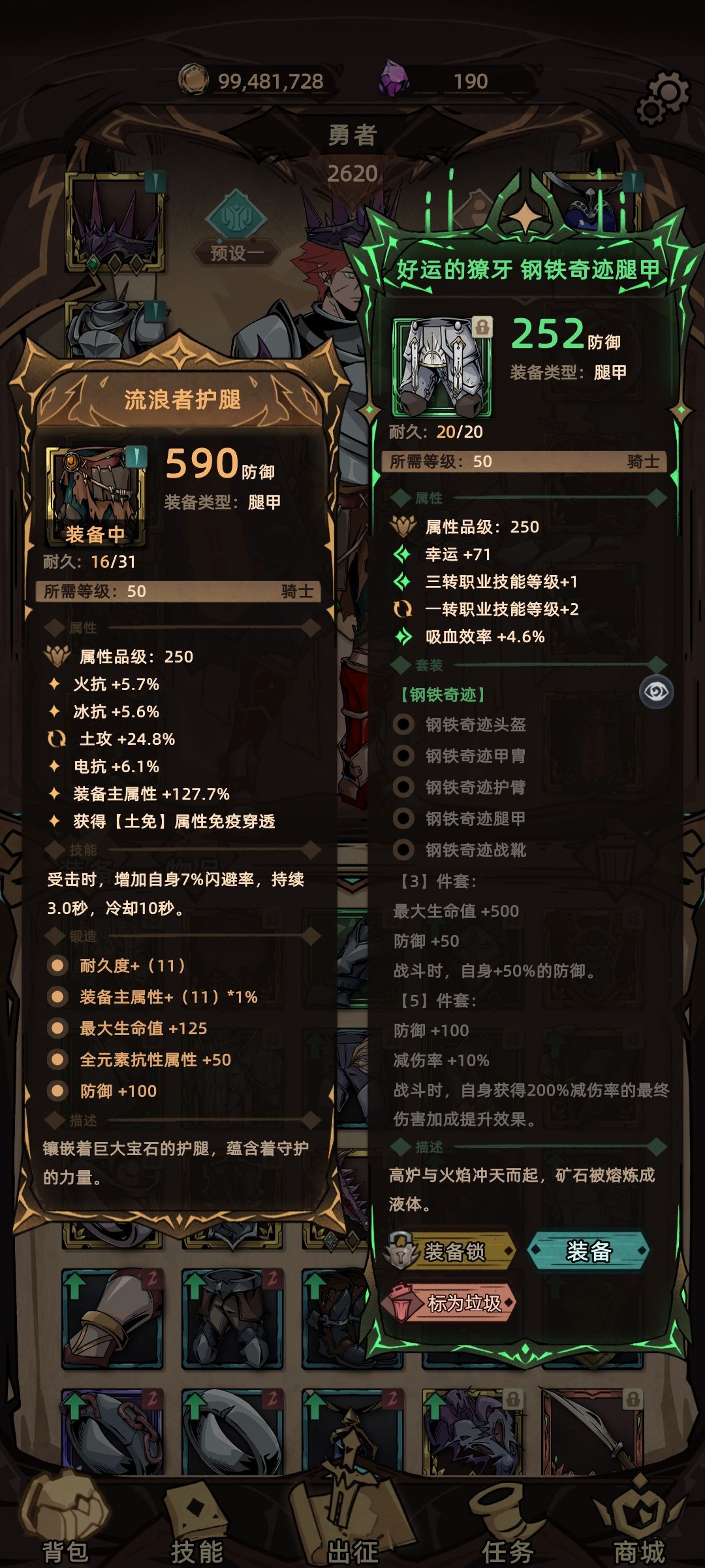 装备后续的选择肯定是钢铁奇迹套装的胸甲、护臂、鞋子来替换上述装备,虽然+50%防御只能在进副本生效一次,但也能加不少防御。