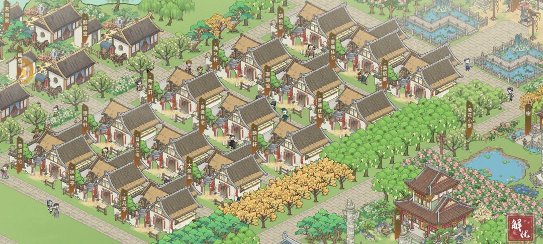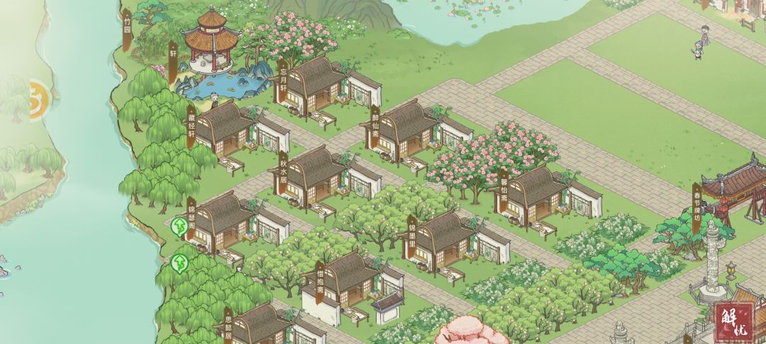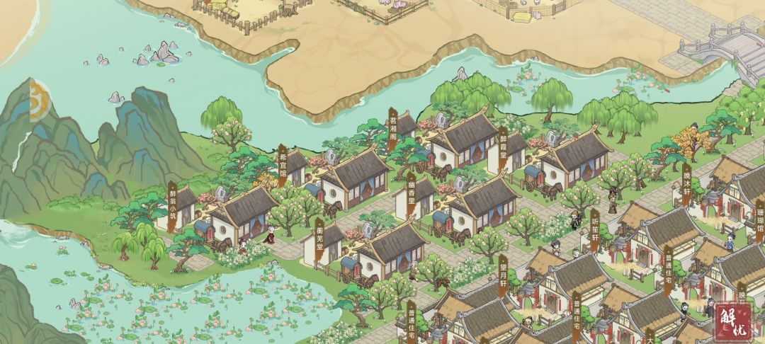 士族住宅区,这一看就是武文弄墨的地方,不仅依山傍水,还有小亭子可以让这些士家文人们饮酒作诗,休闲玩乐!环境相对工人区有了明显改善。