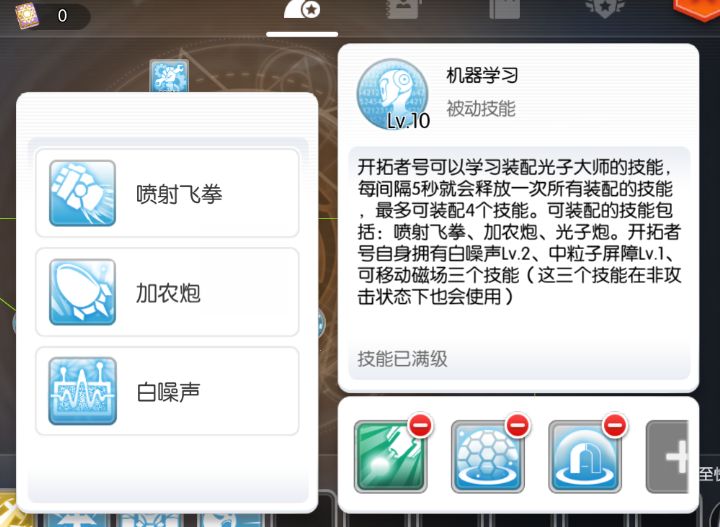 上面的技能和符文给机器人加成看似很高,实际打出来伤害是本体的1/5-1/4样子,不像炼金宝宝那样bt。机器人所携带的技能:光子炮+磁场+中粒子,剩下一个随意,因为是PVE,白噪声没什么用,带加农炮或者飞拳输出也不会提升很多,所以可以选择空着。