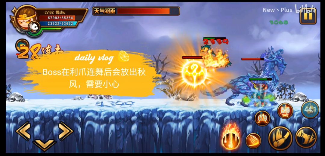 三、过图技巧首先,在角落打boss,让boss把召唤物放在角落,并且利用召唤物进行回血的续航,需要小心的是boss的秋风为虐技能,这个技能会吸蓝,往往会在利爪连舞技能后释放,所以看到boss进行爪子攻击后就要进行躲避秋风了。详情看我的图片,我看到了boss利爪攻击后立刻背对boss躲避秋风