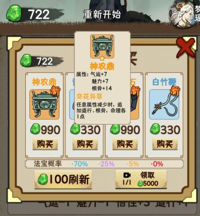 在游戏的进行过程中,会随机出现商店,各位修仙者可以用获得的灵玉来购买法宝,而这些法宝对修行和提升属性是很有裨益的,能够直接提升修仙者的实力!