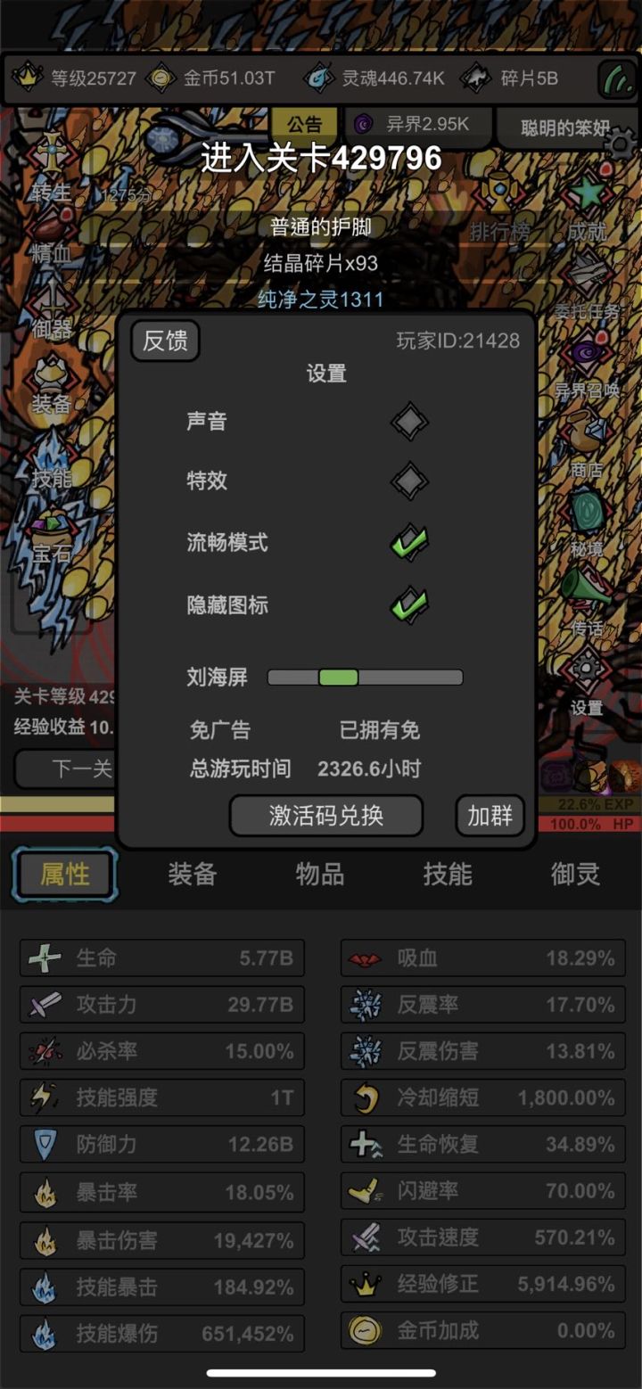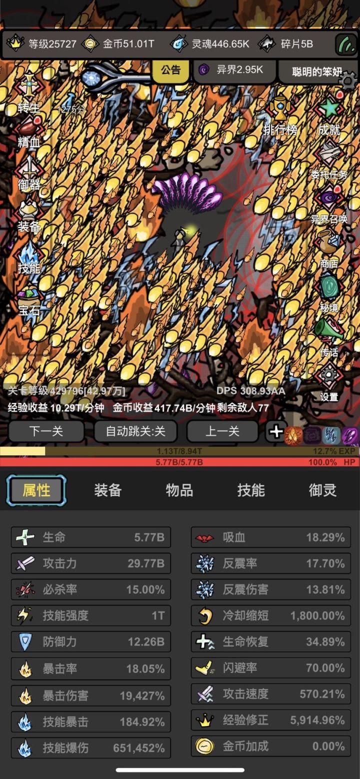 1、游玩几百小时候技能流会遇到瓶颈(8w?、15w层会卡很久),这是正常情况。慢慢挂机,保证双倍够、一分钟能一级就行。此时可以转生增加技能加成及爆伤,顺带看看技能宝箱广告增加一下技能强度。一个技能每秒10次以上就OK了。