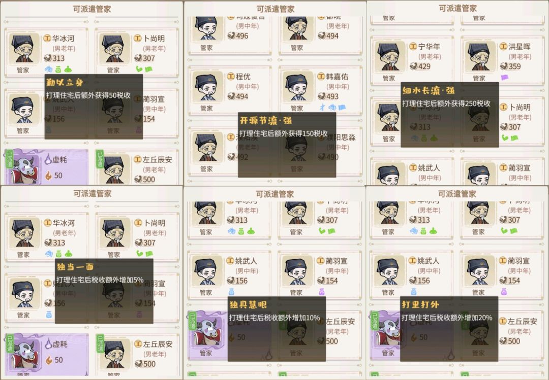 说明3:护院和婢女增加商人的幸福感,不增加税收。但管家的属性和技能会额外增加税收。下面单独分析。
