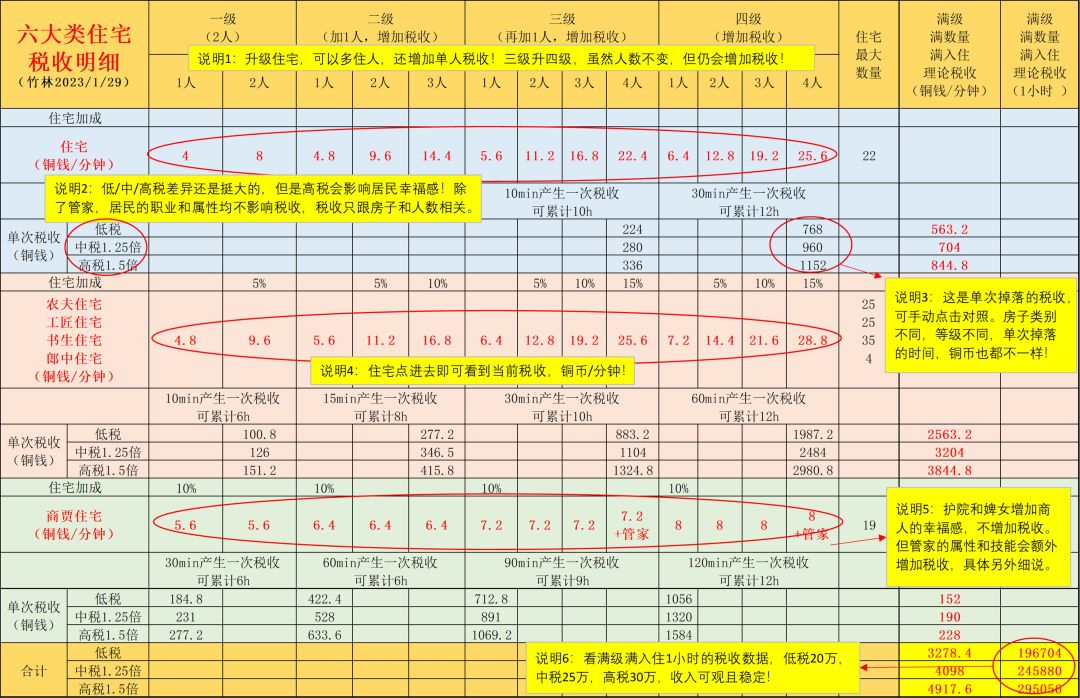 说明4:看满级、满入住1小时的税收数据,低税20万,中税25万,高税30万,收入可观且稳定!纯白嫖省事!