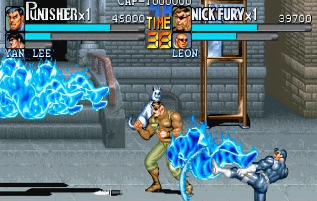 因为《惩罚者》在当年的火爆程度,不同版本的游戏这一招带出来的特效也不尽相同,最给我留下深刻印象的是日版的《惩罚者》,罚叔一脚回旋不仅能带出优雅的月光,更能让受到伤害的敌人带上蓝色火焰的效果,十分酷炫。