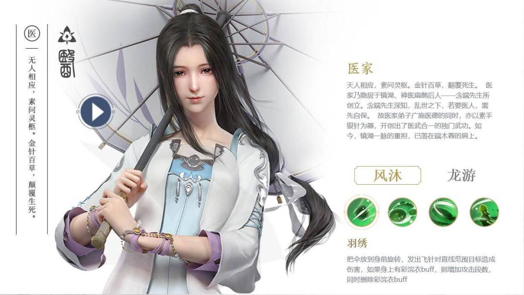 在创建角色时,医家共有两个武学体系可供选择,分别是“风沐”和“龙游”。虽然二者都属于医家,但在技能方面是有很大区别的。“风沐”更倾向于提供治疗效果的辅助位,“龙游”则更加倾向于控制效果的输出位,先来看下“风沐”的技能。