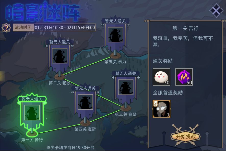 活动内容:活动期间,将推出5关全新的残阵,按固定时间逐步开放。通关对应的残阵关卡会获得(元宵、魔晶)奖励,全服首个完成关卡的玩家会获得额外的“解密达人”专属头像。
