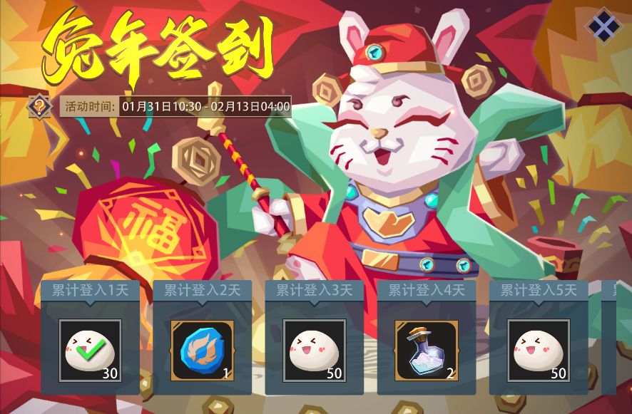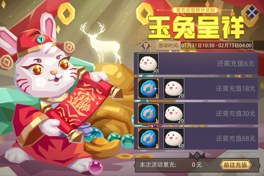 活动内容:兔年送吉祥,幸福万年长。祝你兔年大吉,财源滚滚。活动期间,以任意形式累计充值金额达到指定额度,即可领取(元宵、魂石、灵魂碎片、传奇英雄)等额外奖励。