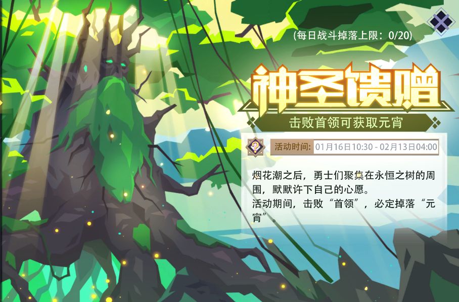 活动内容:活动期间,在(冒险模式/冒险试炼场/梦魇模式)下击败任意“首领”,均可获得随机数量的“元宵”;每日上限为20个。“元宵”可用于[元宵大战]活动中抽奖。