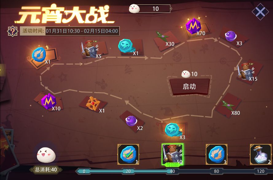 活动内容:活动期间,可消耗固定数量的“元宵”来启动游戏,随机获得奖励。该活动每日无次数限制。累计消耗“元宵”数量达到下方进度条所示数量时,还可以领取(训练假人、魂石、魔晶、幻彩之尘)等额外奖励。