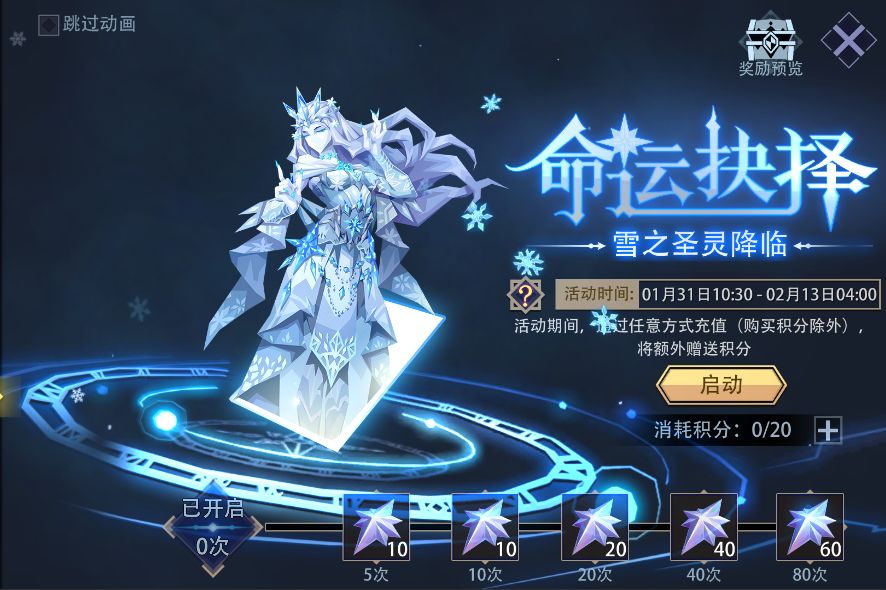 活动内容:活动期间,通过任意方式充值(购买积分除外)额外赠送“积分”,1元等于1“积分”。需要消耗“积分”来启动游戏,可获得神系“雪之圣灵(英雄)”、“春晖仙乐(皮肤)”、“霜雪之巅(卡背)”、“动态头像”等。