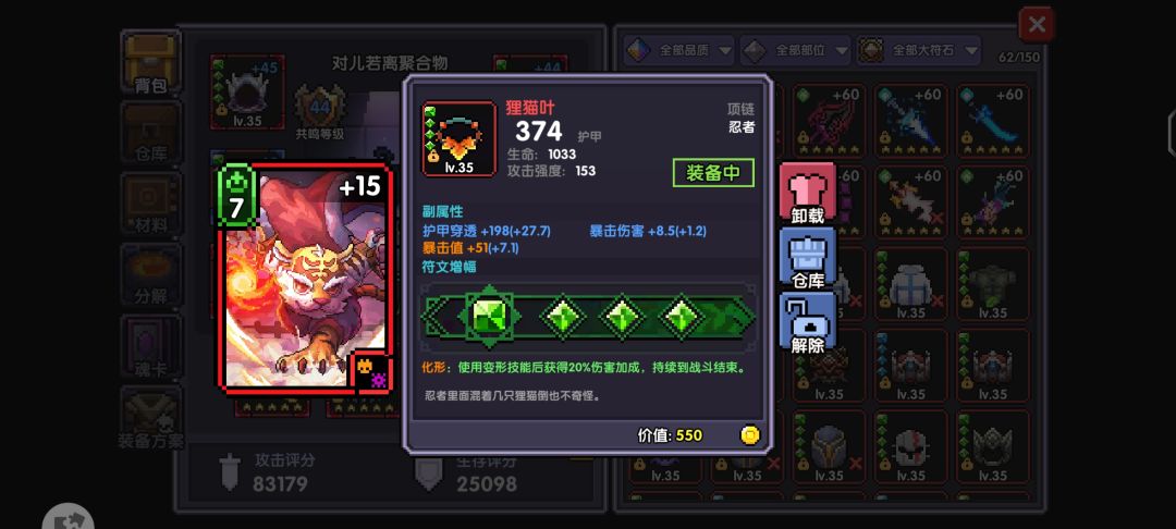 项链:吐槽一下,计算完了那个9技伤项链和狸猫叶的收益,然后发现狸猫叶完胜。