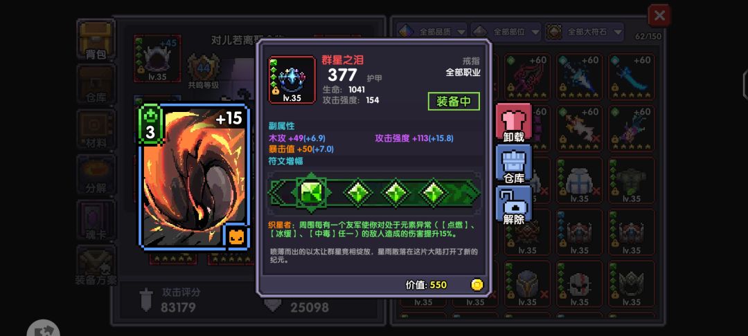 戒指:群星之泪,前提是得有三个队友,还得有负面效果(这个应该不是问题,毕竟都得吃帕尔效果),享受45全伤加成,这个版本可以说是第一组队戒指。