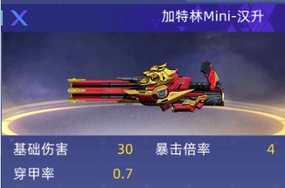 加特林Mini-汉升:三国汉升降临于全民枪神“猛虎暮夕雄心盛,余威独慑胆气寒”。由三国纪元的未来科技打造,射速极快。拥有技能:不动如山(在生化模式中,当架起加特林后会提升射击速度和攻击力,但是移动速度会大幅度降低。)非常离谱的一把机枪,可以在生化模式中形成巨大的火力压制,使我们的防守点变得牢不可破。