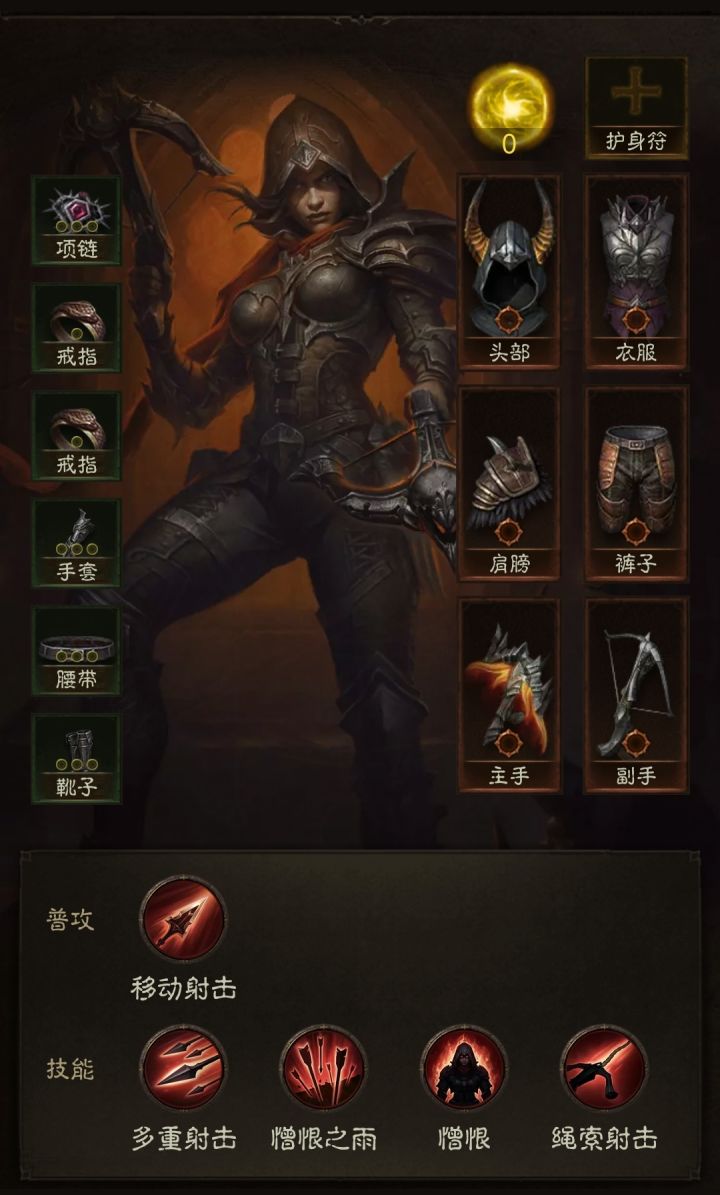 普攻及技能选择:移动射击、憎恨、憎恨之雨、多重射击、绳索射击。